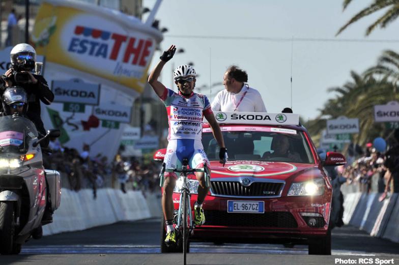第95回ジロ・デ・イタリアは、5月11日にウルビーノからポルト・サン・テルピディまでの210kmで第6ステージを行い、コロンビアのミゲルアンヘル・ルビアーノ(アンドロニジョカットリ)が、単独で逃げ切って区間初優勝した。2位争いはルビアーノと一緒に10km地点から逃げ出した仲間だったアドリアーノ・マローリ(ランプレ・ISD)、ミハウ・ゴワス(オメガファルマ・クイックステップ)、アレクサンドル・ディアチェンコ(アスタナ)、チェーザレ・ベネデッティ(ネットアップ)の4人がスプリントを競い、マローリがトップでゴールラインを通過した。マリア・ローザのラムナス・ナバルドースカス(ガーミン・バラクーダ)は16分近く遅れてゴール。マローリが総合で首位に立ち、イタリアに今大会初のマリア・ローザをもたらした。ルビアーノは残り34km、カテゴリー3のモンテグラナーロ峠で逃げグループからアタック。そのまま一人旅を成功させて区間優勝した。彼は4ヶ所あった山岳ポイントの3ヶ所をトップで通過し、山岳賞のマリア・アッズーラも獲得している。