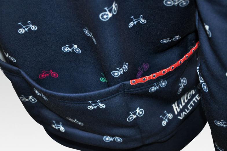 いろいろな種類の自転車のシルエットがドット状にプリントされたデザイン。 ブラックベースに白でプリントされており、普段使いに最適。 右袖や袖口の裏側にワンポイントデザインがあり、ポケットの内側に隠れている自転車はカラフルにプリントされていて、シンプルなデザインのアクセントとなっている。